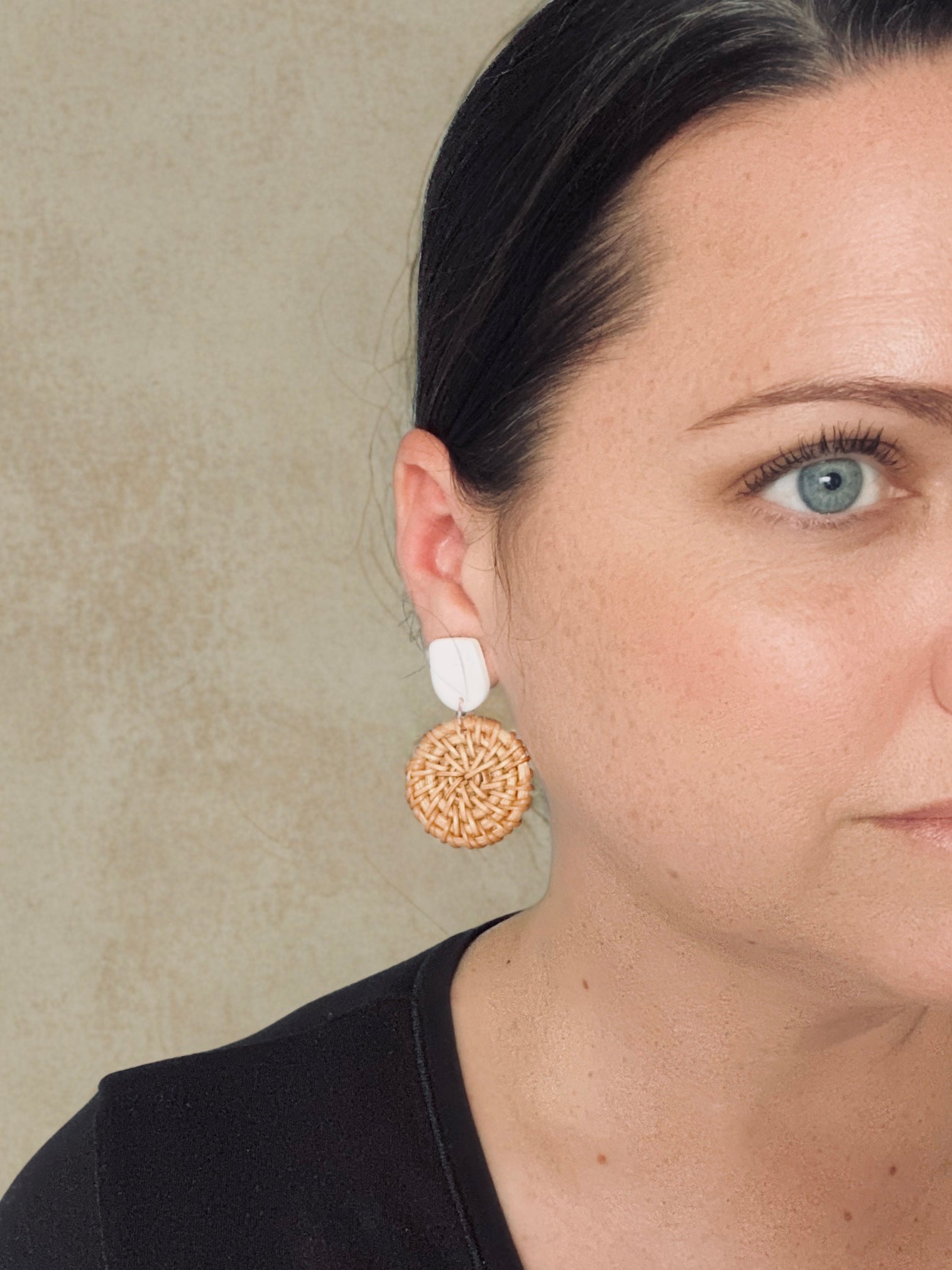 - Lightweight polymer clay stud top with a 35mm woven rattan drop